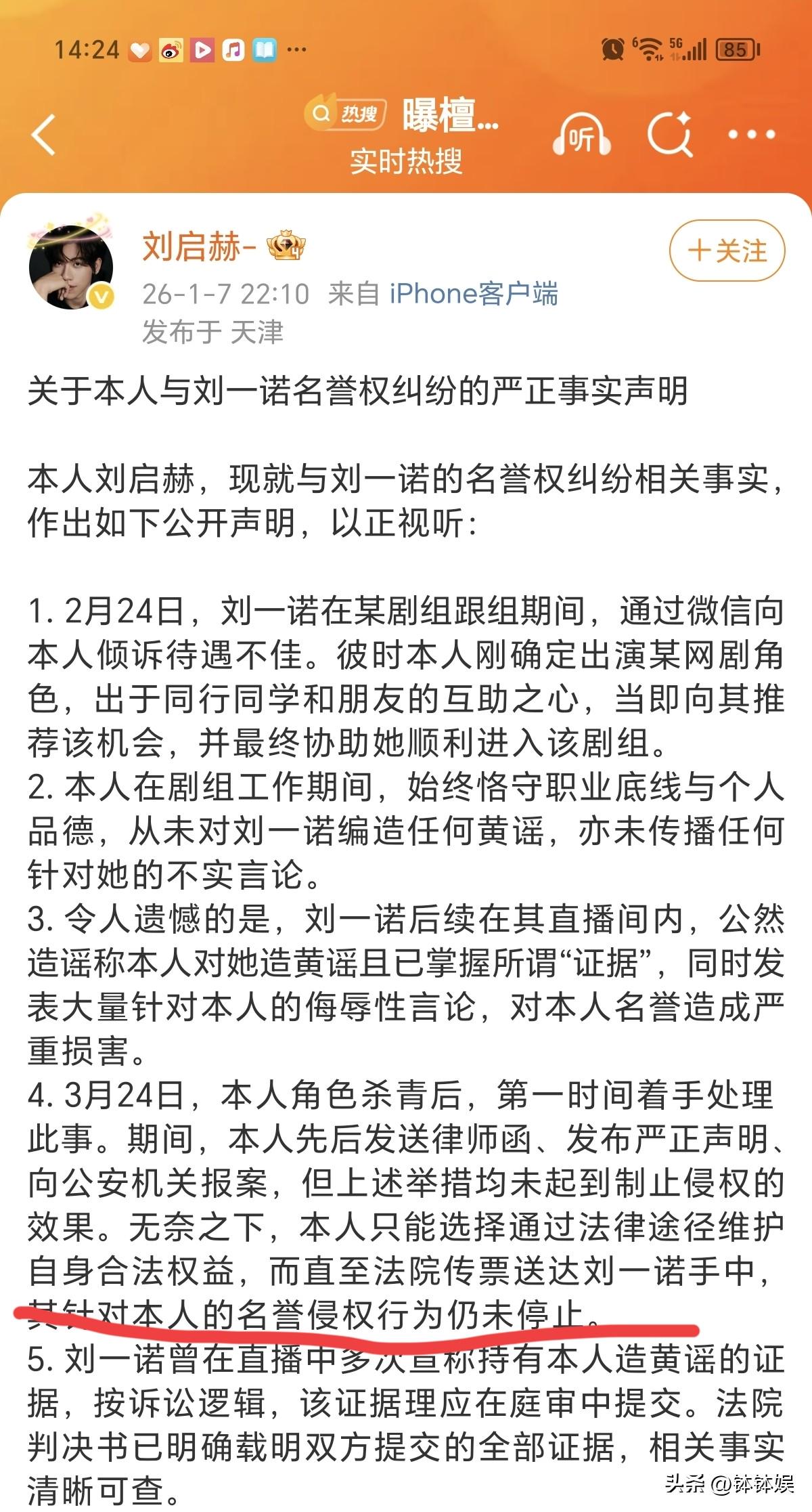 1月7日,也就是刘一诺点名檀健次的同一天,演员刘启赫下场,晒出他与与刘一诺名誉权纠纷案的判决书。