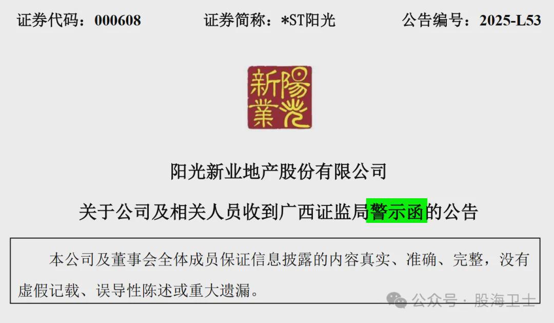 2025年4月30日,中国证监会广西证监局对阳光股份(*ST阳光,000608)出具了《警示函》。