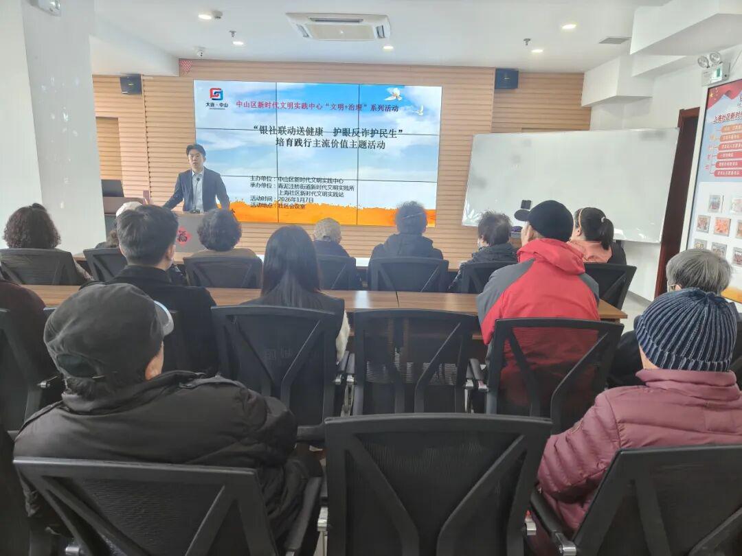 中山区青泥洼桥街道上海社区新时代文明实践站开展“银社联动送健康 护眼反诈护民生”主题活动,邀请建设银行工作人员开展反诈宣讲,同时联动银行眼科企业合作伙伴提供免费眼科义诊服务,为辖区居民民生福祉保驾护航。建设银行工作人员聚焦老年群体等重点人群财产安全问题,以“守护养老钱,平安护民生”为核心开展反诈讲座,结合近期高发的虚假投资、冒充亲属借款、仿冒银行客服诈骗等典型案例,拆解诈骗套路,重点提醒居民警惕陌生来电、不明链接和高额回报诱惑,牢记“不透露、不转账、不轻信”的反诈准则。同时,工作人员现场解答居民关于金融安全的各类疑问,手把手指导大家识别诈骗陷阱,帮助居民提升识骗、防骗能力,筑牢财产安全的民生防护墙。