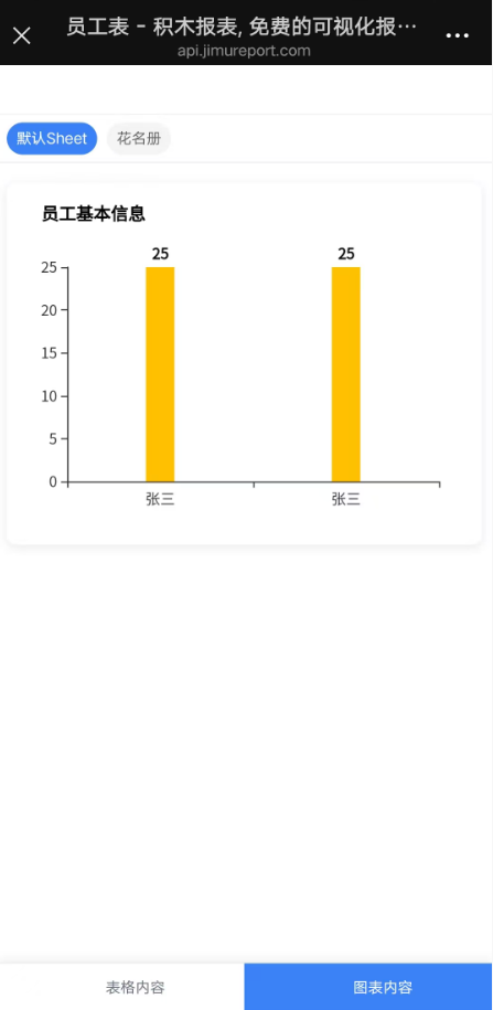 移动端报表与图表采用分开展示的方式,通过点击 "表格内容" 与 "图表内容" 标签来切换查看。