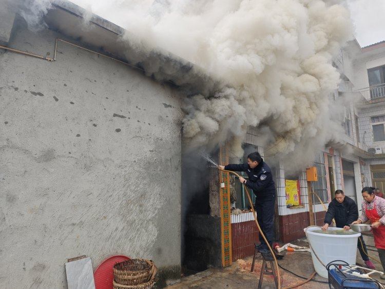 “还未到村口,便望见远处浓烟弥漫。赶到周大叔家时,只见厨房房顶火光闪动,噼里啪啦作响,火苗借着风势正向旁边的屋舍蔓延,空气中满是烧焦的气味。”赶来救援的民警立马分成两组,一组立刻使用灭火器压制门口火势,另一组则寻找水源并连接水管。