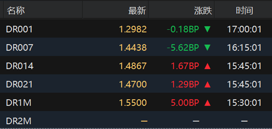 银行间回购定盘利率表现分化。FR001涨1.56个基点报1.3456%;FR007持平报1.52%;FR014跌1.0个基点报1.56%。