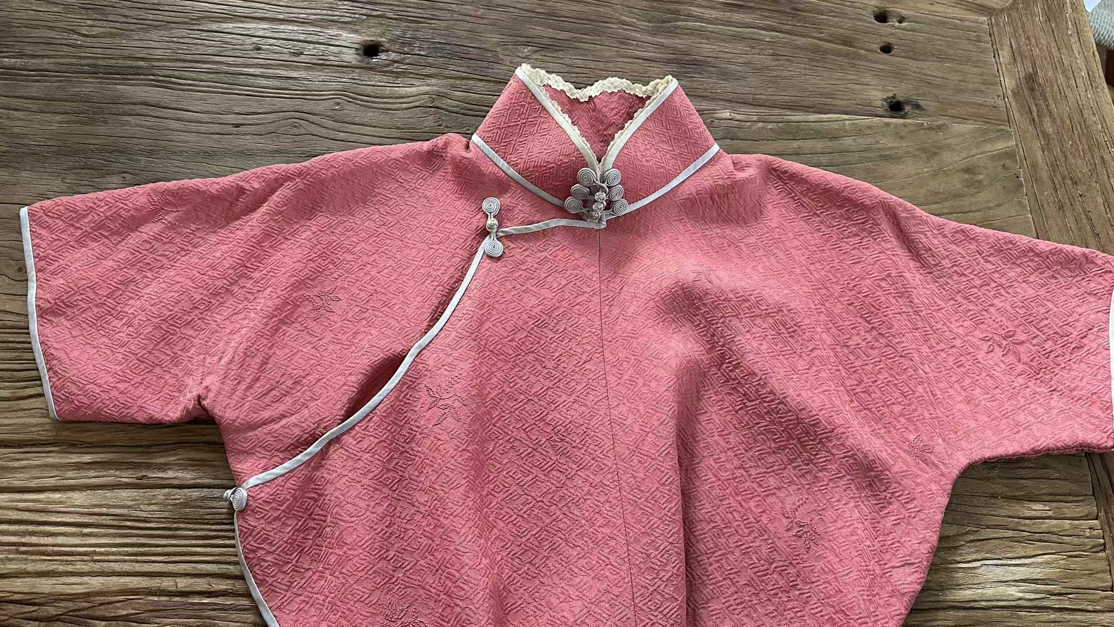旗袍整体装饰遵循“简而不素”原则,依托面料纹理与线条凸显美感,契合女性“大气温婉”的气质。其包边工艺平整扎实,起脚后饱满无凸起,衣身内外不见线迹,整体版型兼具结构与曲线美感,实现人与衣服的融合。