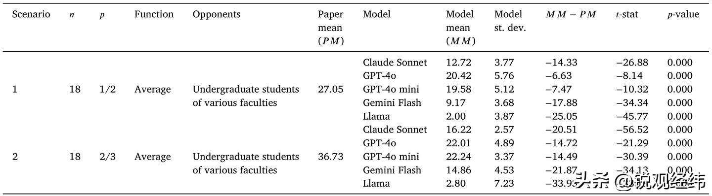 8. 结果颠覆常识。早在1995年,经济学家罗斯玛丽・纳格尔的经典实验证明,在“取平均值三分之二”的任务中,人类平均出价约为37;若目标是“一半”,则约为27。而本次所有AI模型的输出均显著偏低,多数逼近零点,即便是相对较高的GPT-4o,也明显偏离人类典型反应区间。