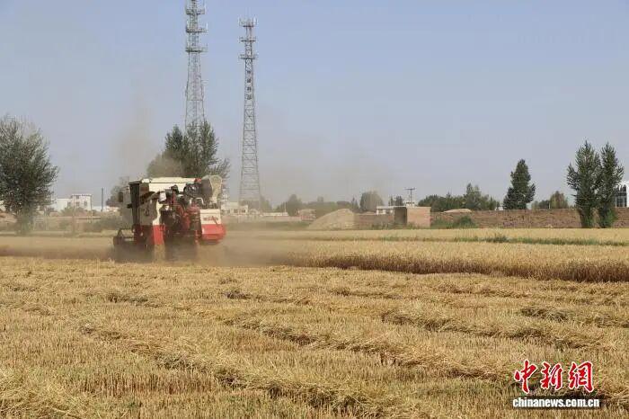 图为联合收割机在民勤县麦田中作业,确保优质小麦颗粒归仓。(资料图) 马爱彬 摄