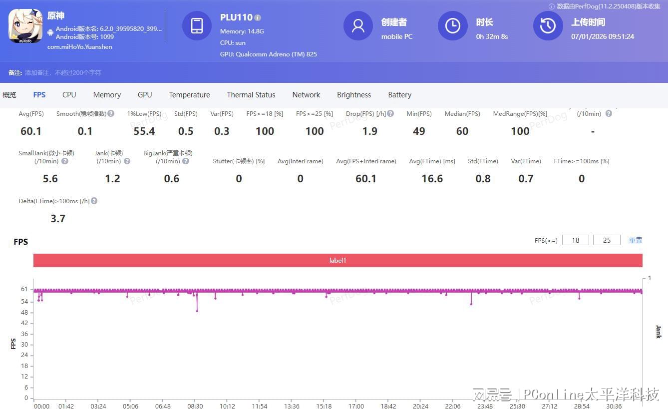 面对高负载的《原神》游戏,一加 Turbo 6同样表现出色。在最高画质下进行跑图测试,依旧能够保持稳定的帧率输出,且机身温度也控制得当,不会因过热而影响游戏体验。