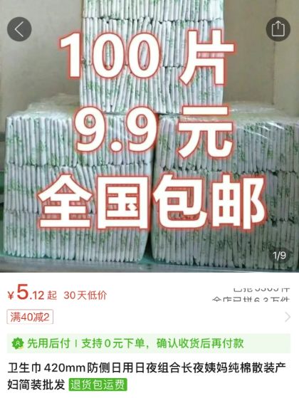 散装卫生间价格真心便宜,网购一大包几十上百片,才几块钱还包邮。这种卫生巾都是用透明塑料袋装的,有的便宜到按斤卖。