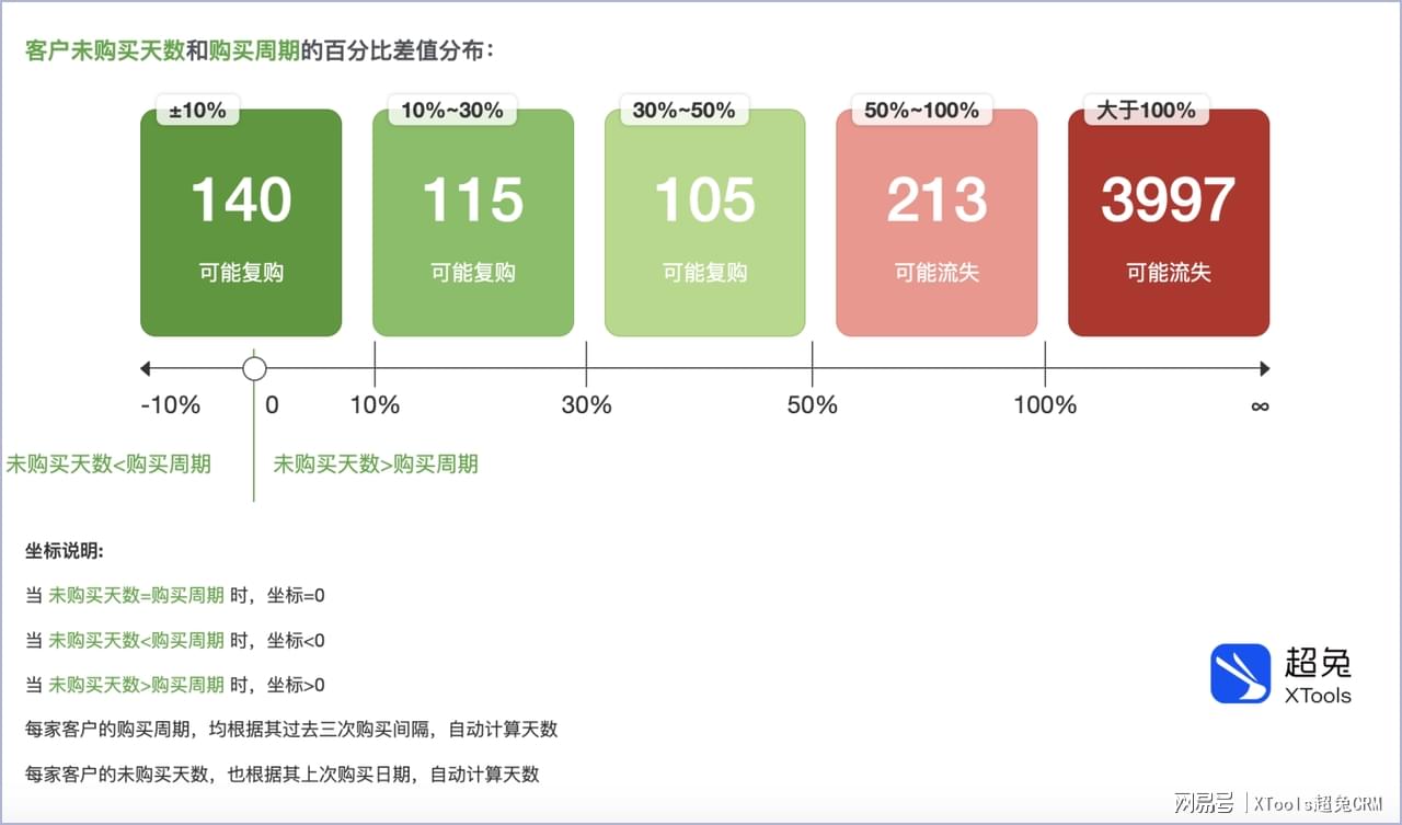 这一过程中,可借助客户数据自动化分析工具,精准识别高复购潜力客户与流失风险信号,为生命周期管理提供数据支撑。复购和流失预警功能,其核心算法为:自动计算客户最近三次消费平均间隔天数(平均购买周期),对比最近一次购买天数,通过公式(最近购买天数 - 平均消费间隔)/ 平均消费间隔 ×100%,将结果按 ±10%、10%-30%、30%-50%、50%-100%、100%+ 区间分布,直观展示客户复购或流失状态。