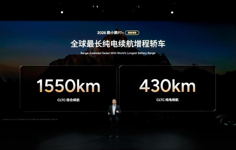 作为本次发布会的明星车型,2026款小鹏P7+以“全球纯电续航最长增程轿车”身份登陆36国市场,彰显小鹏全球化实力。该车凭借“大油箱+大电池+超快充”黄金组合,CLTC综合续航达1550km,纯电续航430km,纯电模式最低电耗仅10.9kWh/100km,刷新行业能耗纪录。49.2度5C超充AI电池支持800V超充倍率,12分钟即可完成10%-80%充电,10分钟补能277km,彻底解决里程焦虑。