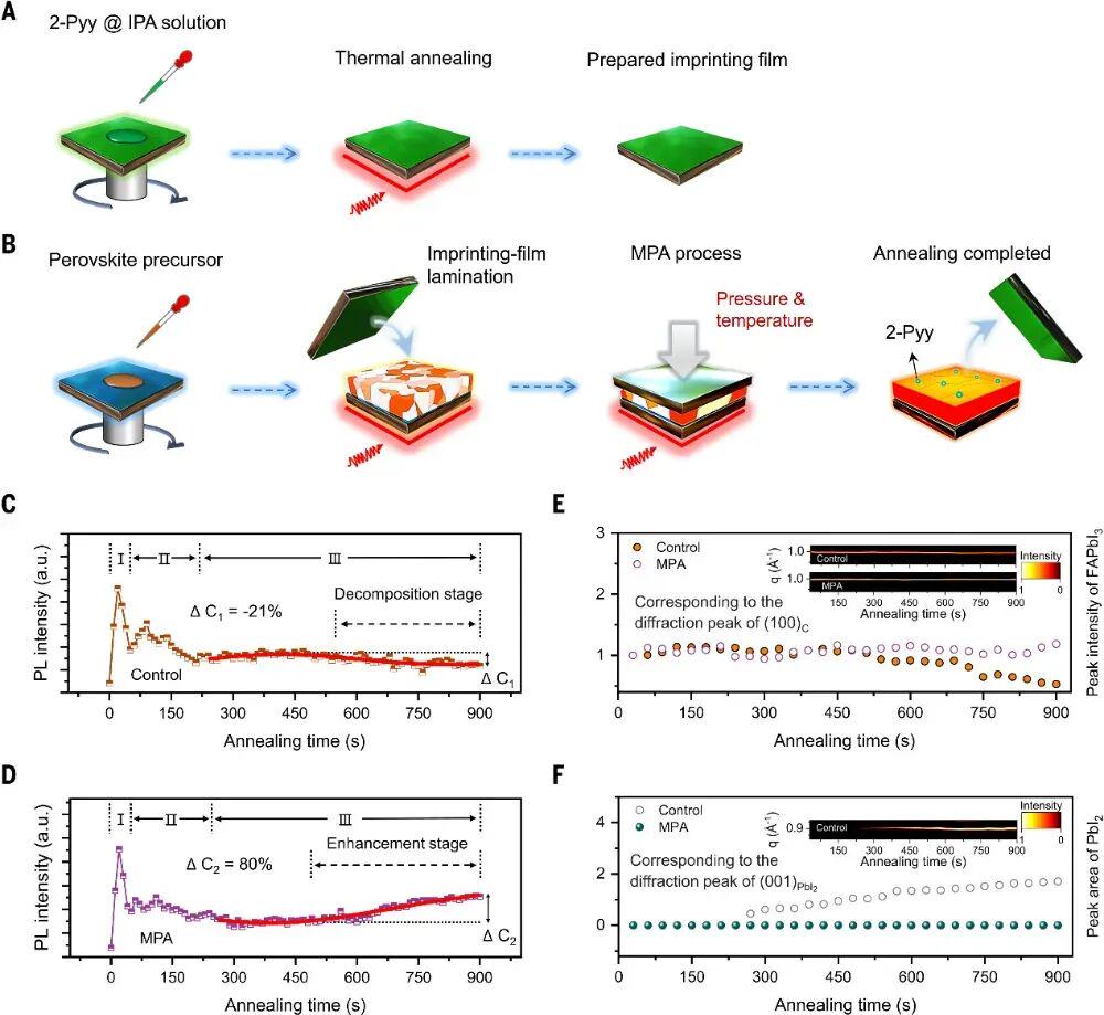 图1:分子压印退火(MPA)的工艺流程及退火过程中钙钛矿薄膜的原位PL与XRD表征