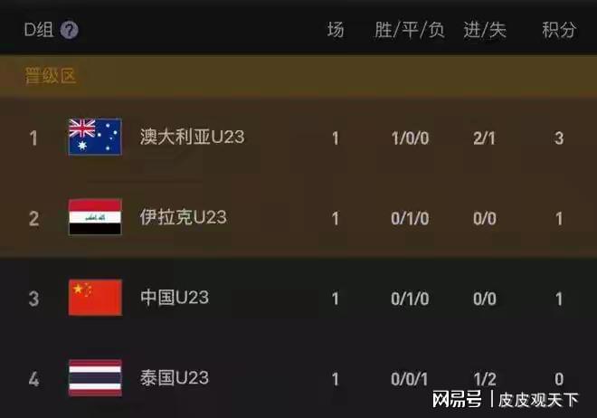 首轮战罢,D组积分榜形势为:澳大利亚3分领跑,中国和伊拉克同积1分,泰国0分垫底。根据出线规则,每组前两名晋级,4分是大概率安全线,5分则几乎确保出线。