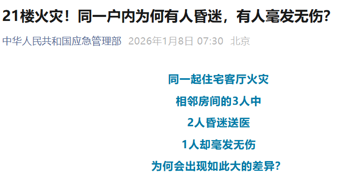 首先给这些官媒点个赞,他们能把这事儿报道出来,并且也说到了,这个小伙和这对父女,同一个火情,差不多同样的处境,他们之所以一个好好的,两个昏迷,就是因为小伙关门挡住了烟,父女没关门、没挡住烟,要知道,烟气才是致人死伤的杀手。