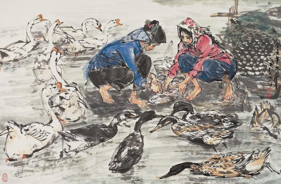 此次展览巧妙地从三个维度展开黄胄的江南世界,“水乡游子”聚焦水乡景致与渔猎、牧牛等日常生活场景,展现江南人民的勤劳质朴;“万物有灵且美”捕捉鸭鹅、水牛等生灵的动态神韵,洋溢自然生趣;“与古为徒”是黄胄对传统的承袭与重塑。