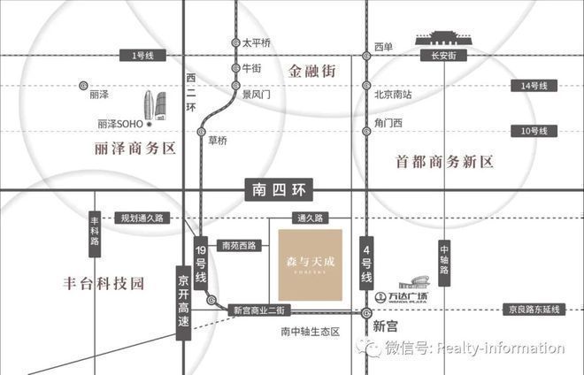 四环旁约1KM,4号线19号线交汇。首都商务新区约3KM,丰台科技园约4KM,丽泽金融商务区约5KM(直线距离)。