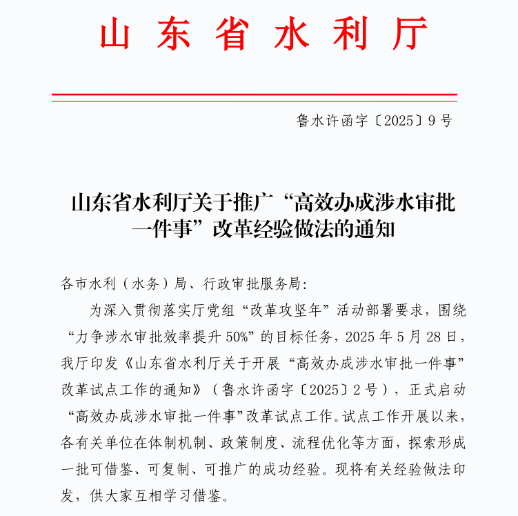 近日,山东省水利厅印发《山东省水利厅关于推广“高效办成涉水审批一件事”改革经验做法的通知》,将德城区探索开展的涉水许可“菜单式”集成审批改革经验作为先进典型,面向全省进行推广。