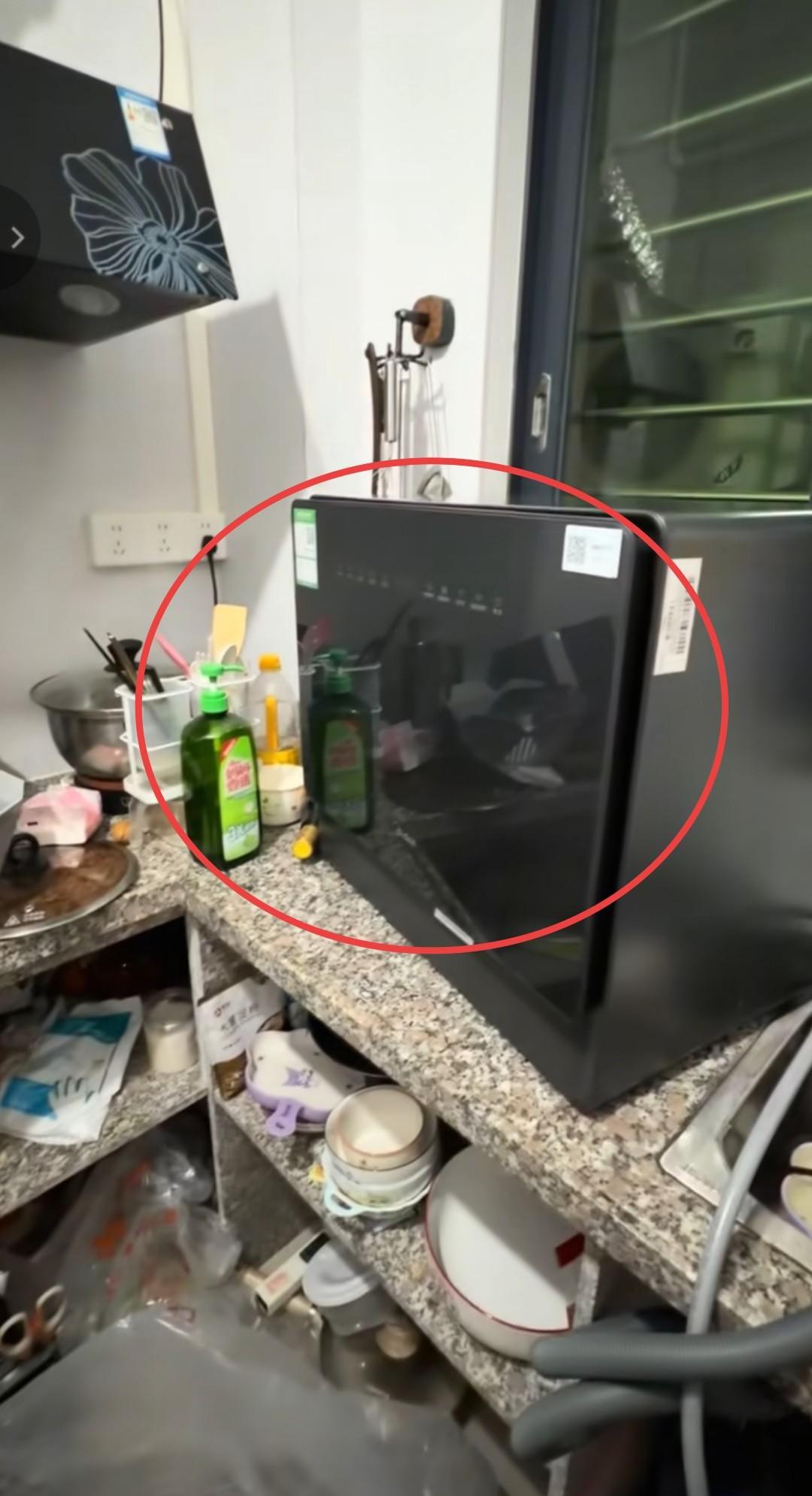 看图,王女士租的房子真的很小,而且厨房堆满了杂七杂八的东西,洗碗机往上面一放,根本没有多余的地方放东西。