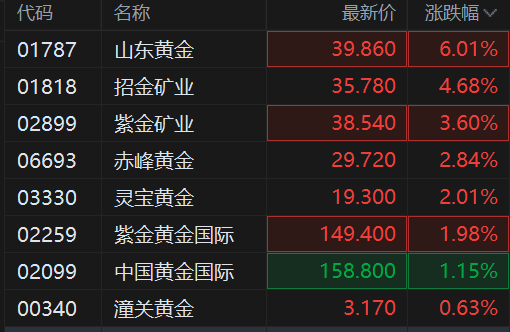 港股黄金股集体上涨,其中,山东黄金涨超6%,招金矿业涨近5%刷新历史新高价,紫金矿业涨3.6%,赤峰黄金涨2.8%,紫金黄金国际、中国黄金国际、潼关黄金跟涨。