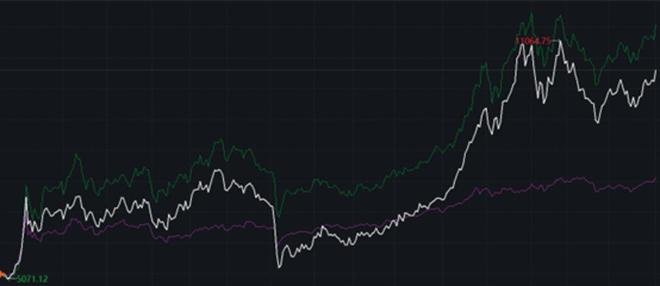 白:申万消费电子。紫:上证指数。绿:申万电子指数