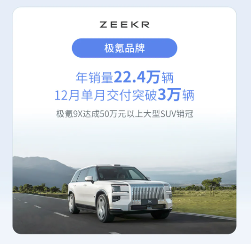 极氪品牌全年销量22.4万辆,12月单月交付突破3万辆,极氪9X成为50万元以上大型SUV销冠。