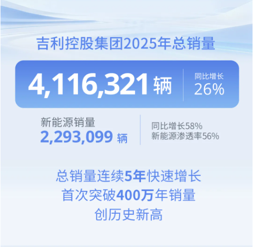 值得注意的是,吉利汽车2025年总销量3024567辆,超额完成年中上调后的300万辆年度销量目标,同比增长39%,创历史新高。