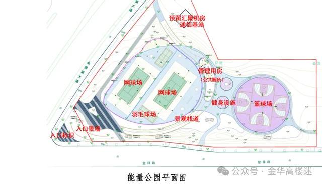 能量公园位于金漪湖大道与金祥路转角地块,面积约12000平方米。设计以青年友好运动空间为主题,建设网球场2处、标准篮球场1处,半篮球场2处、羽毛球场2处、管理用房(含公厕)结合景观栈道1处及其他相关服务设施等。