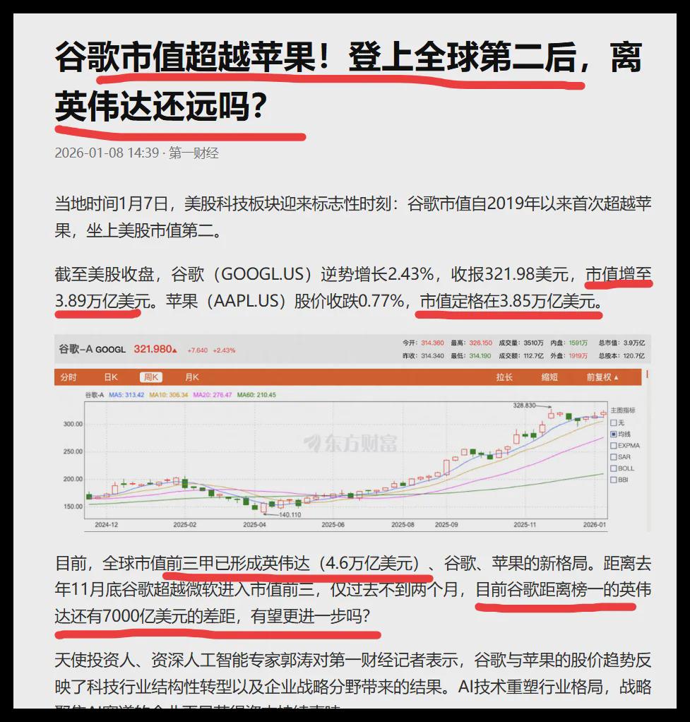 最新消息,谷歌市值超越苹果,仅次于英伟达——目前谷歌市值3.89万亿美元、苹果3.85万亿美元,英伟达4.6万亿美元。