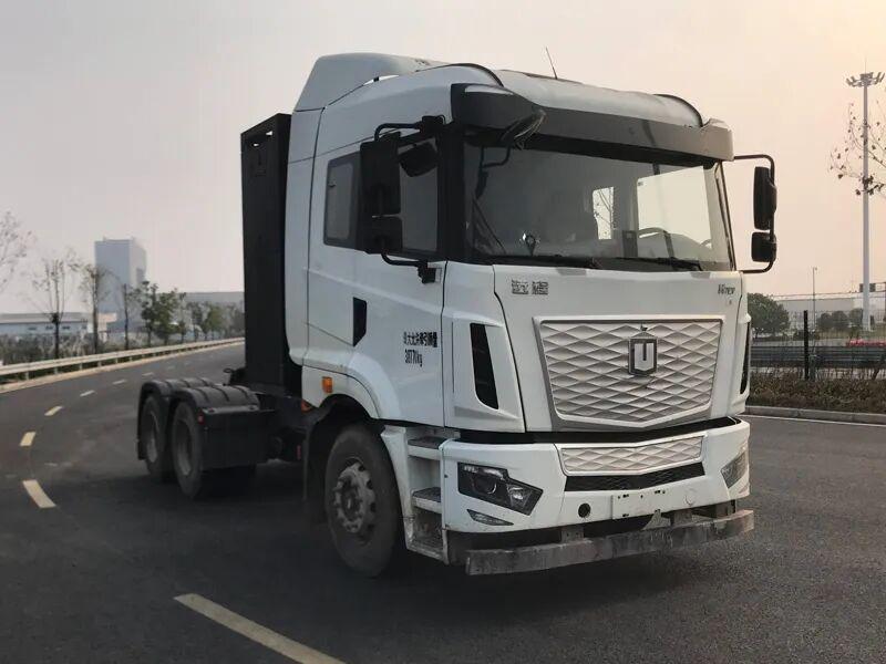 2、J6E插电式混合动力牵引车:动力性能强劲,搭载解放动力CA6DV1-58E66柴油机+法士特电机,发动机输出580马力,电机峰值功率200千瓦,油电协同发力,适配复杂路况下的高效运输。