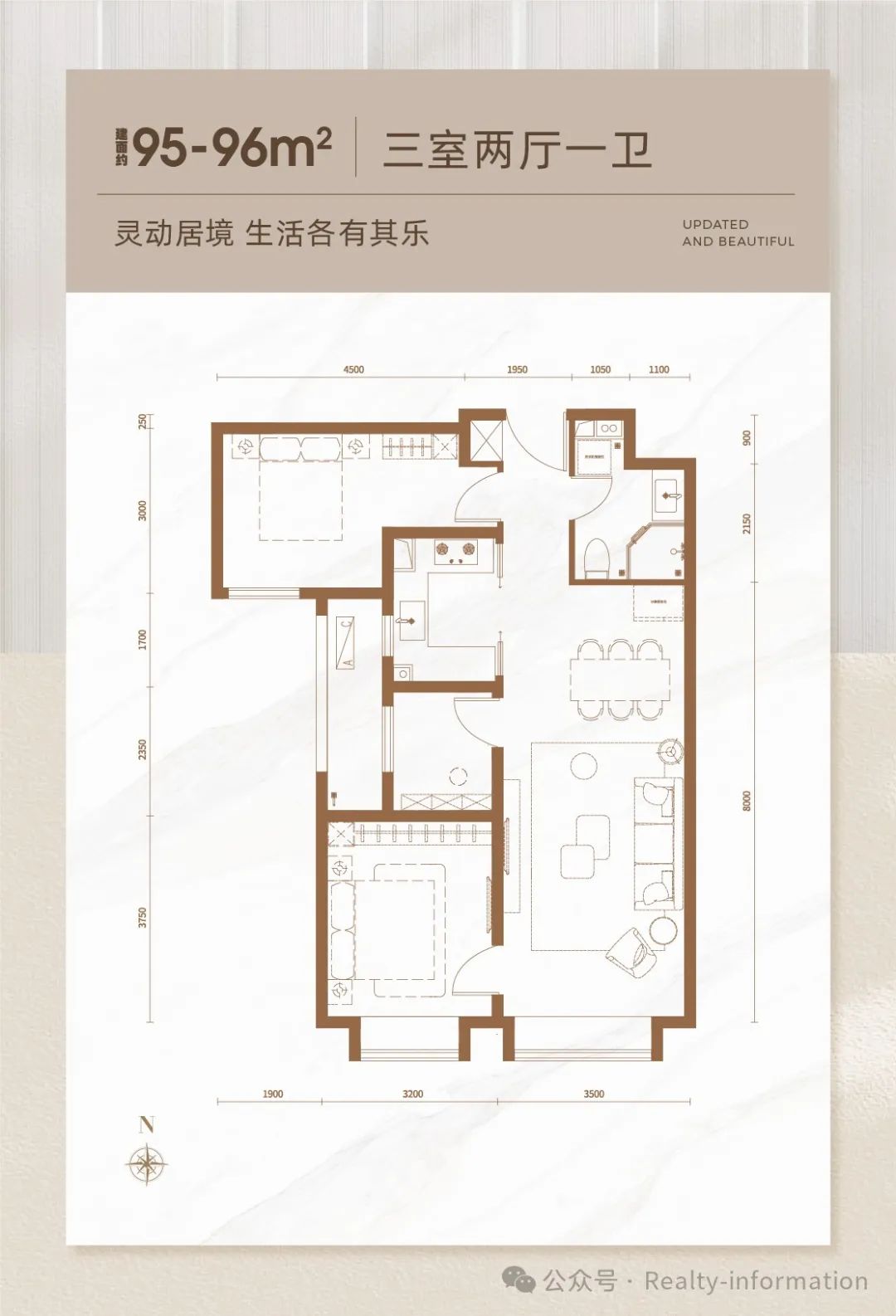 建面约95-96㎡三居 餐客一体通厅 南向双卧 多功能书房↓