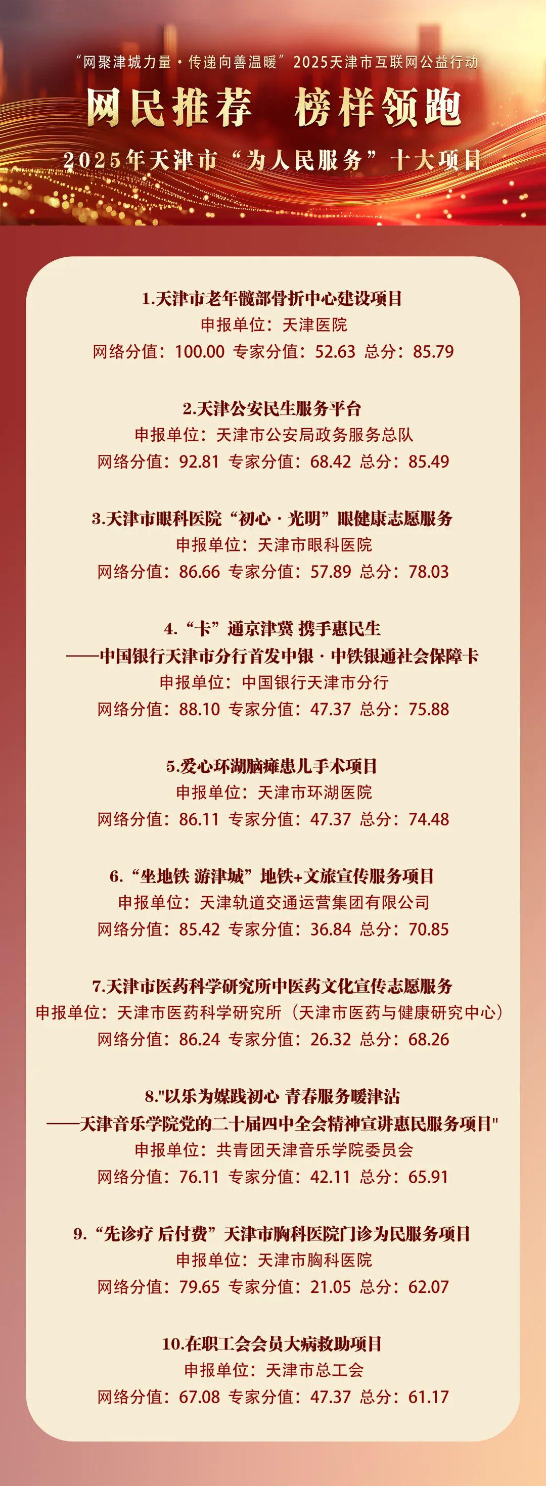 年终岁末,由2025天津市互联网公益行动组委会主办,海河传媒中心经济广播、惠民发布客户端承办的网民推荐:榜样领跑——2025年天津市“为人民服务”品牌项目、窗口单位公益宣传活动结果出炉。综合网民推荐和组委会专家评审推荐,最终推出重点宣传的2025年“为人民服务”品牌、项目和窗口单位。