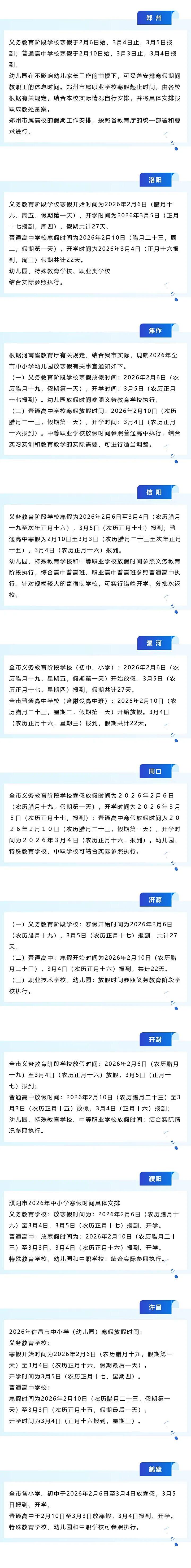 截至1月8日,河南已有11地市相继发布通知,确定2026年中小学寒假时间。通知明确:要求各学校做好师生安全教育和健康教育,科学指导学生假期活动,严格规范办学行为,加强学校安全管理。