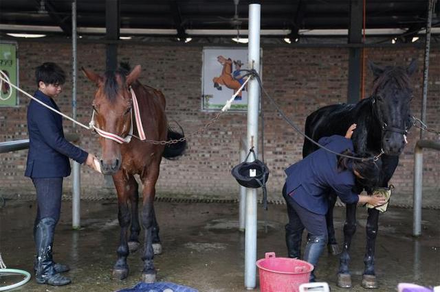 想要尽快与马熟络,摸清每一匹马的脾气习性,孩子们要每天给马洗澡、铲马粪,定期帮马修掌,清理马厩,一天中的大部分时间都和马待在一起。图为:马术班学生在训练后清洗马匹(2025年12月23日摄)。