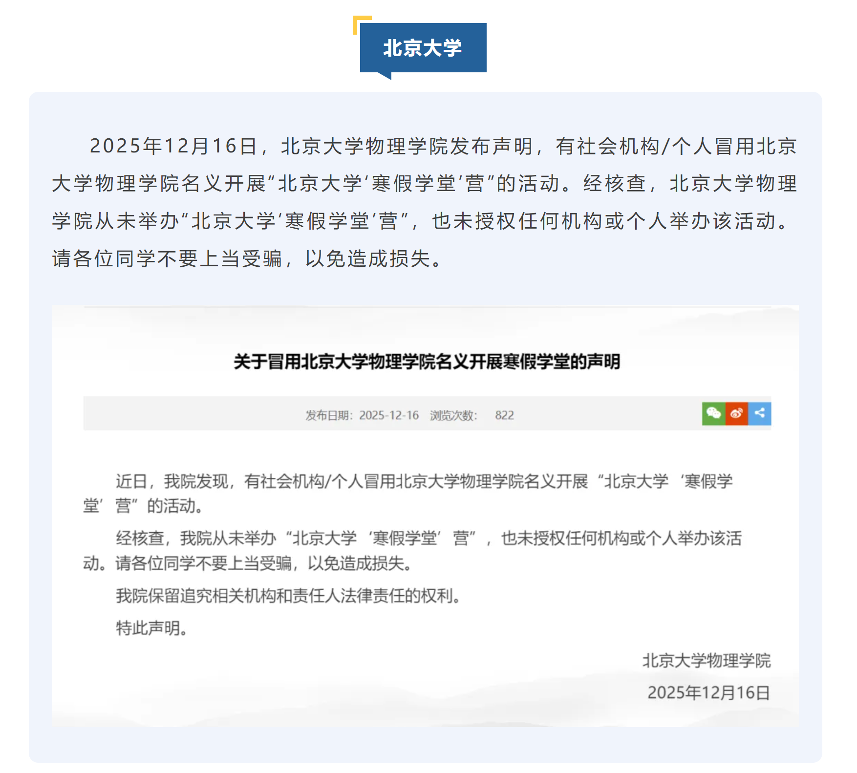 随着寒假的临近,一些打着高校名义的“培训营”“内推名额”“招生咨询”等虚假信息层出不穷。这些虚假信息中,藏着不少精心设计的骗局,轻则造成财产损失,重则影响升学规划。近期,北京大学、清华大学、香港大学等多所高校接连发布声明,对各类虚假招生、违规活动进行辟谣。为帮助大家规避风险,我们整理了高校官方发布的权威声明,同时附上真假信息甄别指南,助力大家守住升学路上的“安全线”。