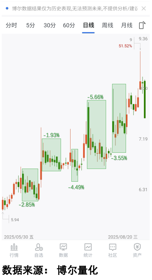 这只股票从2025年5月底的不到6元,涨到8月底的近9元,三个月涨了50%——单看结果挺不错,但过程真的磨人。你看它的走势(看图1),中间有五次冲高回落,换谁都得慌:第一次调整扛过去了,第二次又来,第三次的时候,好多人肯定想“再不走就亏了”,结果卖了之后,股价反而涨得更凶。