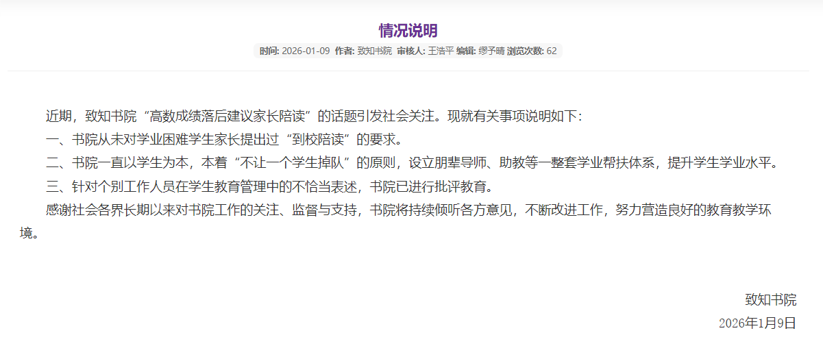 近期,致知书院“高数成绩落后建议家长陪读”的话题引发社会关注。现就有关事项说明如下: