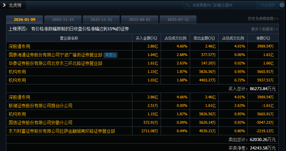 易点天下(301171)今日20cm涨停,成交额61.37亿元,换手率31.68%,盘后龙虎榜数据显示,深股通专用席位买入2.86亿元并卖出2.46亿元,2家机构专用席位净买入1.16亿元。国泰海通证券股份有限公司宁波广福街证券营业部(章盟主)净买入1.61亿元。
