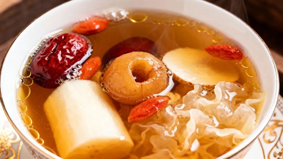 此汤甘甜温润,能补心脾、益气血,常可作为下午的滋补甜点或睡前的安神汤羹。