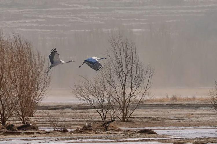 它们盘旋在湿地的上空,羽翼被日光镀上一层柔和的金边,鹤唳清越,混着风的轻吟、林的细语,在天地间悠悠回荡。风托着它们的翅尖,让它们飞得又高又稳,身影在灰蒙的天幕下舒展成灵动的诗行。