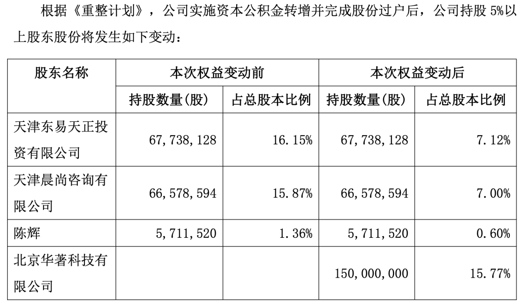 产业投资人华著科技以3.45亿元的总对价受让1.5亿股转增股份,将在重整完成后成为东易日盛控股股东,其实控人张建华也将成为东易日盛新的实际控制人。