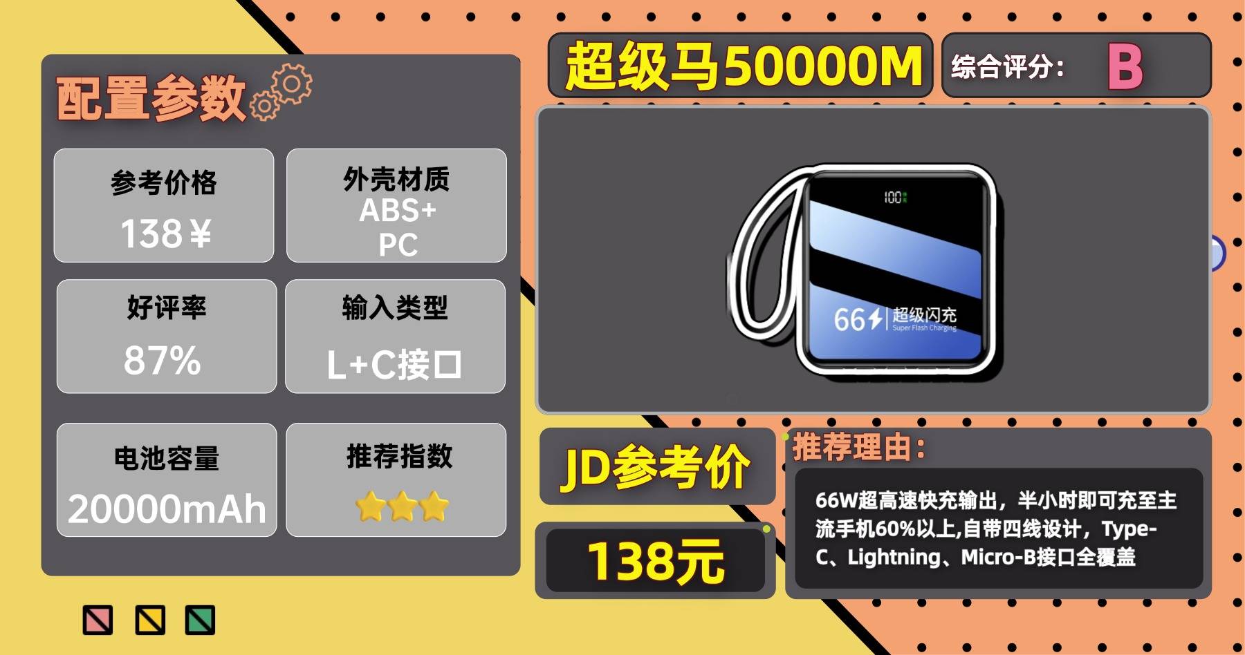 1、高功率快充:支持最高 66W 输出,实测 30 分钟可为大多数手机充到 60% 以上,回血速度快,应急能力强。