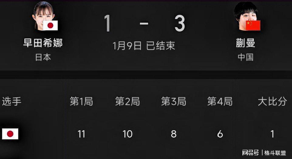 北京时间1月9日下午,WTT多哈冠军赛女单1/8决赛,国乒小将蒯曼3-1战胜日本名将早田希娜,成功晋级八强。