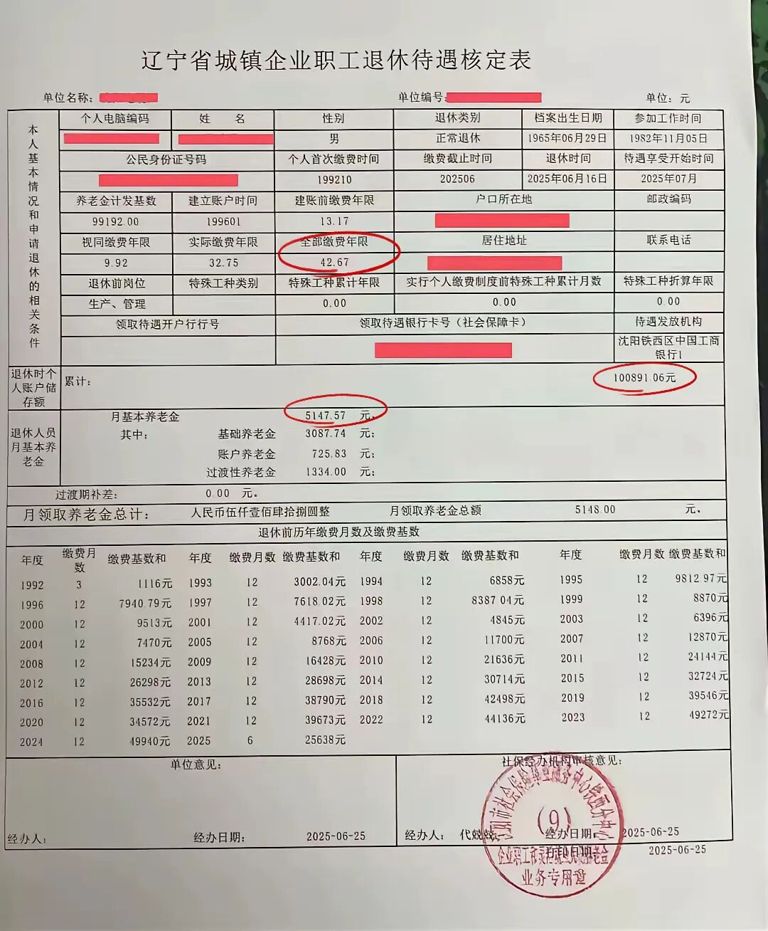 辽宁省大爷,1965年6月出生,60岁正常退休,1982年11月参加工作,2025年7月正式享受待遇, 总缴费年限42.67年(视同缴费9.92年+实际缴费32.75年,合计42年8个月),个人账户余额100891.06元,2024年辽宁计发基数为8266元。
