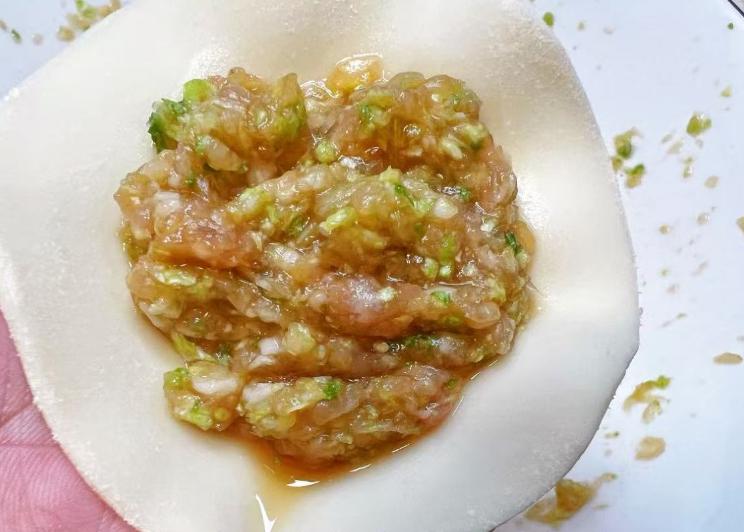 9、取一片饺子皮包入适量的饺子馅。收口捏好,不要让馅料漏出来。