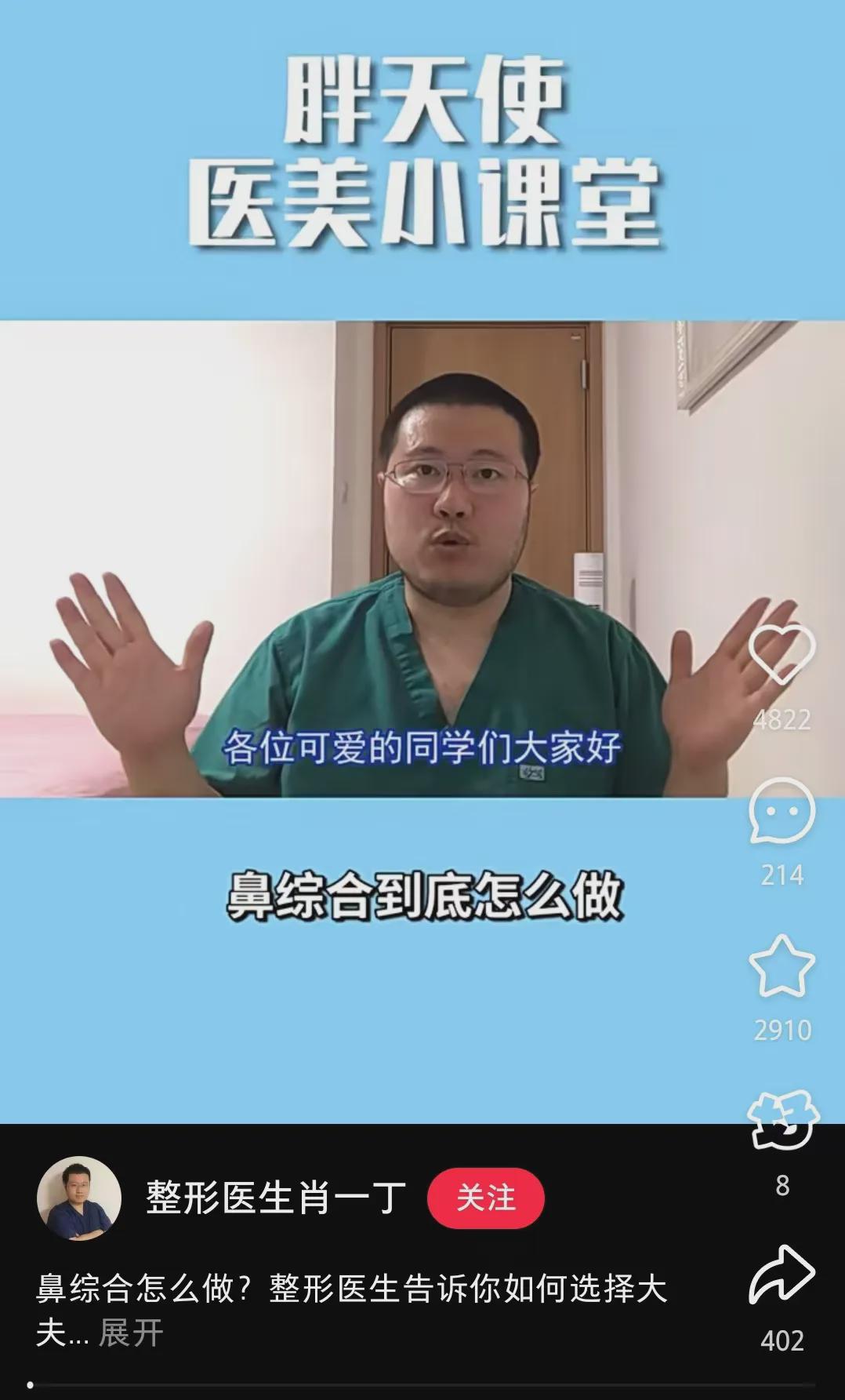 中国医学科学院北京协和医院的“整形医生肖一丁”(49.8万粉丝),创新通过3D动画演示“鼻综合手术”的操作步骤,直观讲解不同假体材料的优缺点,点赞4822,收藏2910,转发402,评论214,深受用户的认可。