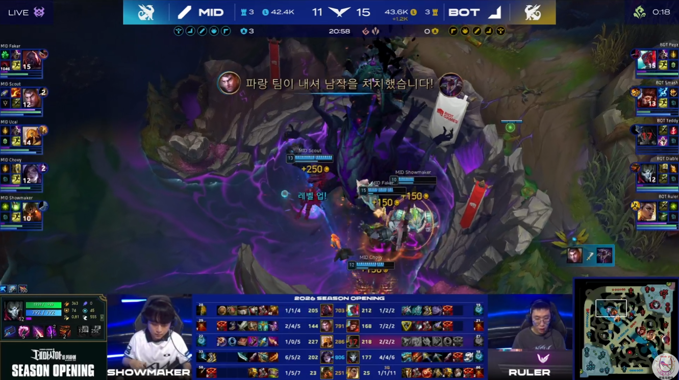 今年韩国LCK季前赛的决赛是双C位置的对决,下路和中单。Faker最后一局也是拿出了最稳的塞恩,Chovy操刀卡莎,Scout打野杰斯,Ucal的沙皇和许秀的泰坦辅助。下路方面是Ruler玩辅助芮尔,上单是Peyz的永恩,打野是Smash的猴子,中单Teddy的兔子,下路是新人Diable的烬。