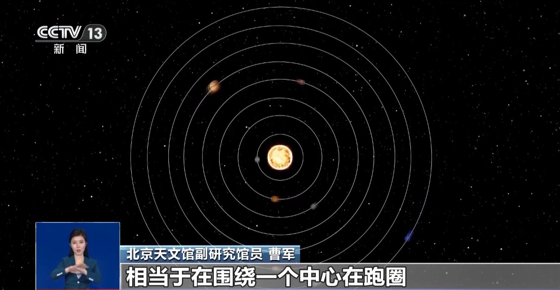 北京天文馆副研究员 曹军:地球以外的这些行星,在运动的时候,有可能从地球上看,它跟太阳基本上成一条直线,这个现象在天文上叫作合。火星是我们地球之外的那颗大行星,它也是绕着太阳有一个公转的运动,它们公转的轨道基本上是在一个平面上。相当于围绕一个中心在跑圈,地球在内侧、火星在外侧,地球跑得快,它跑得慢,那就有可能地球跑到了太阳的另一侧。