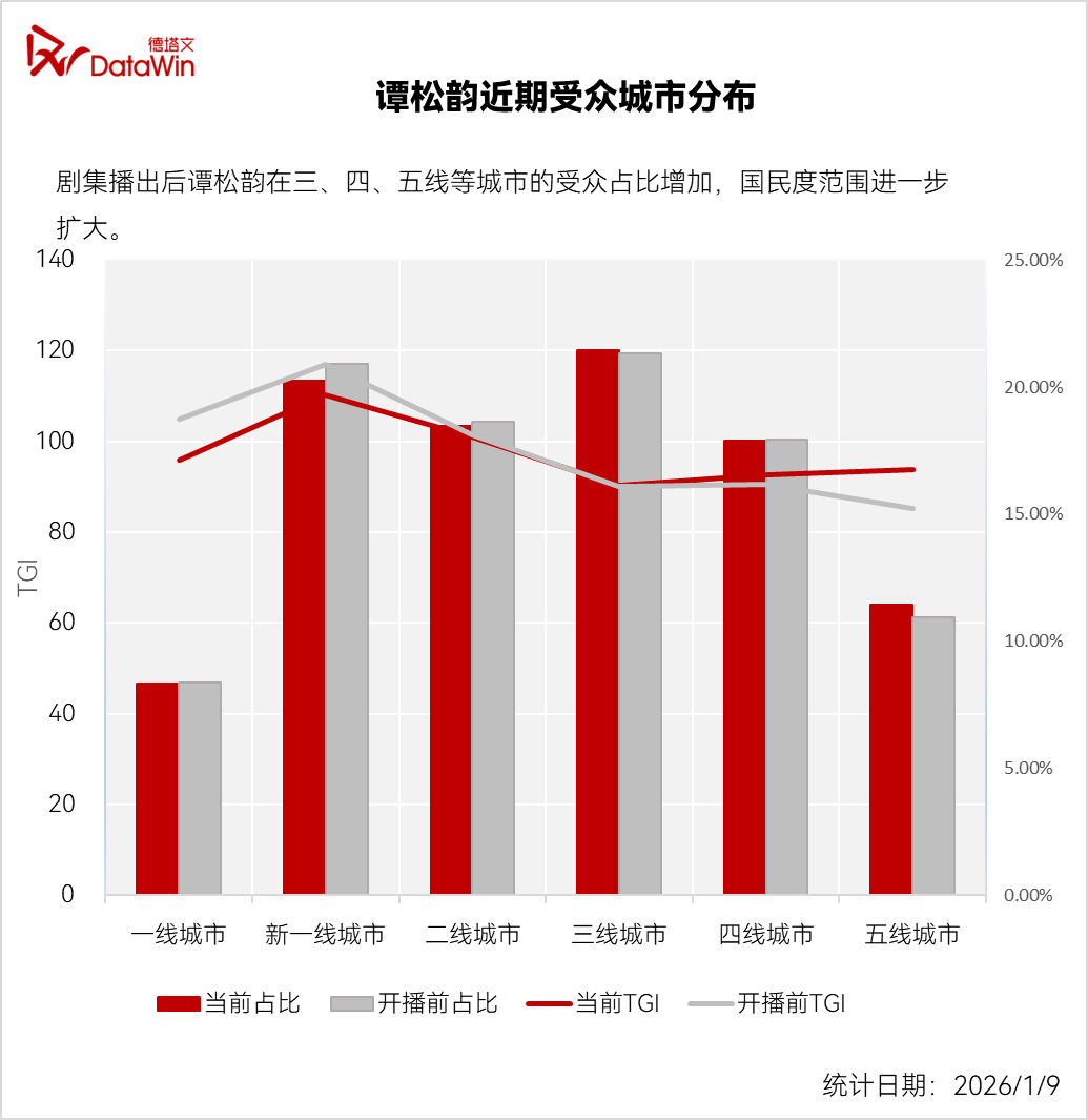 剧集播出后,谭松韵在z世代和熟龄观众群体的关注度增加,且在18-23岁的年轻族群中偏好度较高,并收割了大批三线以下城市拥趸。