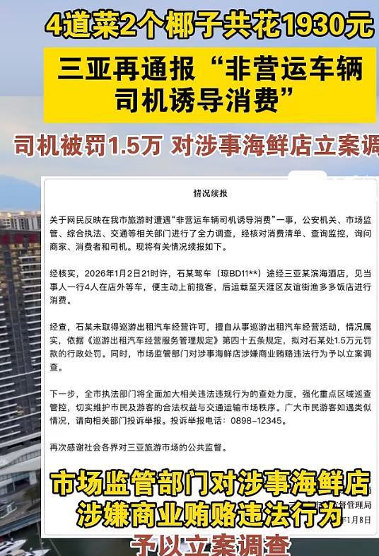 1、湖北日报《三亚再通报“司机诱导消费,4菜花1868元”:司机未取得巡游出租汽车经营许可,罚款1.5万,对涉事海鲜店立案调查》