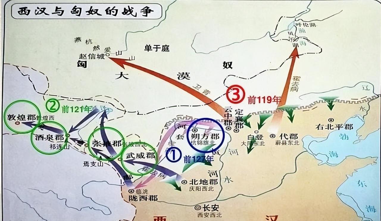 到汉武帝前141年上台,他决定反击。前133年设马邑之谋,虽然没成功,但开了头。前129年卫青出兵上谷,杀了不少匈奴人。前127年又在河南地大败右贤王,收复河套。霍去病前123年参战,十八岁就带八百骑兵深入敌后,杀敌无数。前121年他两次打河西,逼浑邪王投降。