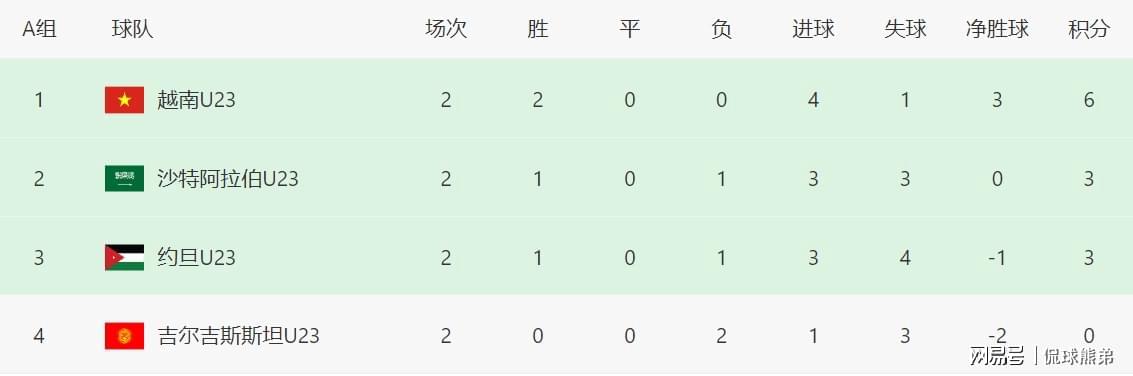 北京时间1月9日晚上到10日凌晨,2026年U23亚洲杯小组赛第二轮A组两场比赛结束,越南男足2-1绝杀吉尔吉斯斯坦男足,拿下2连胜积6分升至小组第一,东道主沙特男足2-3被约旦男足的逆转,遭遇首场败仗,也让这个小组形势变乱了。