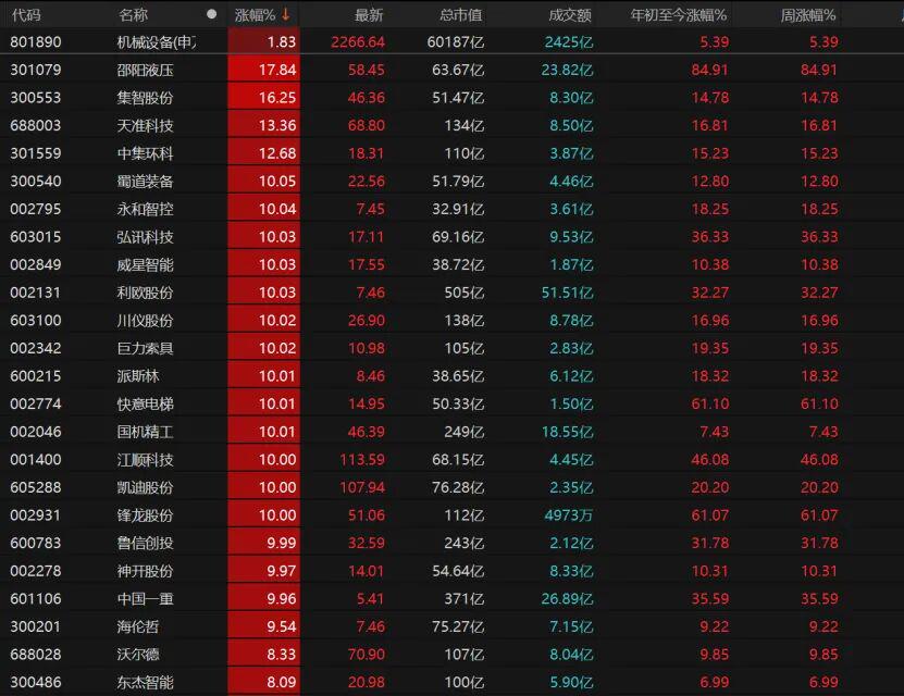 川仪股份、派斯林等15只机械设备个股涨停,邵阳液压继续大涨,集智股份、天准科技、中集环科也表现不错。
